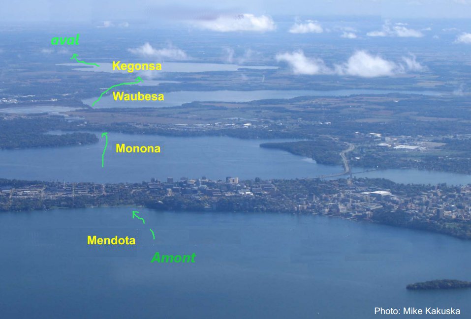 Also, to know more about the Madison Lakes: go consult the nice colored presentation by Richard C. Lathrop, Controlling Eutrophication in the Yahara Lakes: Challenges and Opportunities, presented at the Spring 2009 Community Environmental Forum UW-Madison Nelson Institute of Environmental Studies.