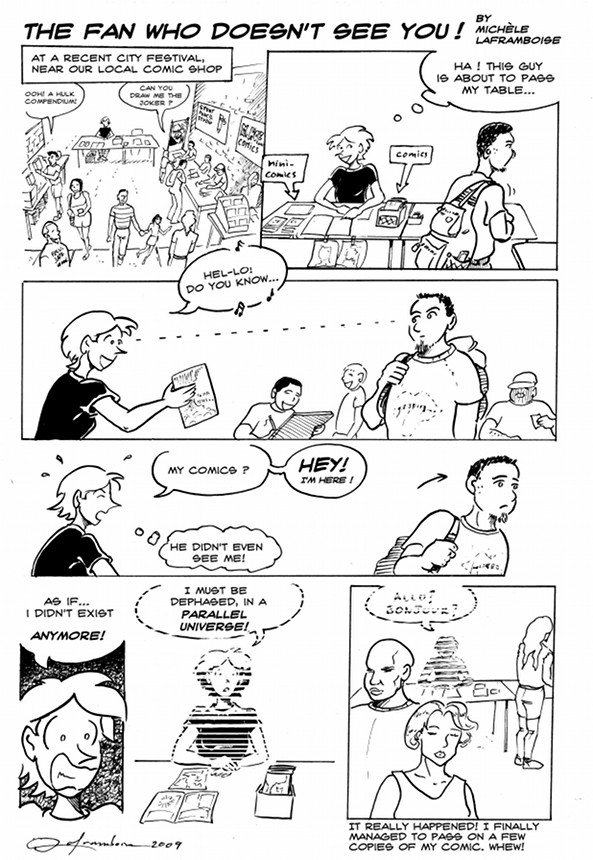 I started my spiel: Hello, do you know my comics… But his gaze did not even registered my presence; it passed over me as if I was invisible. I talked a bit louder, Hello-o? Hey, I EXIST!