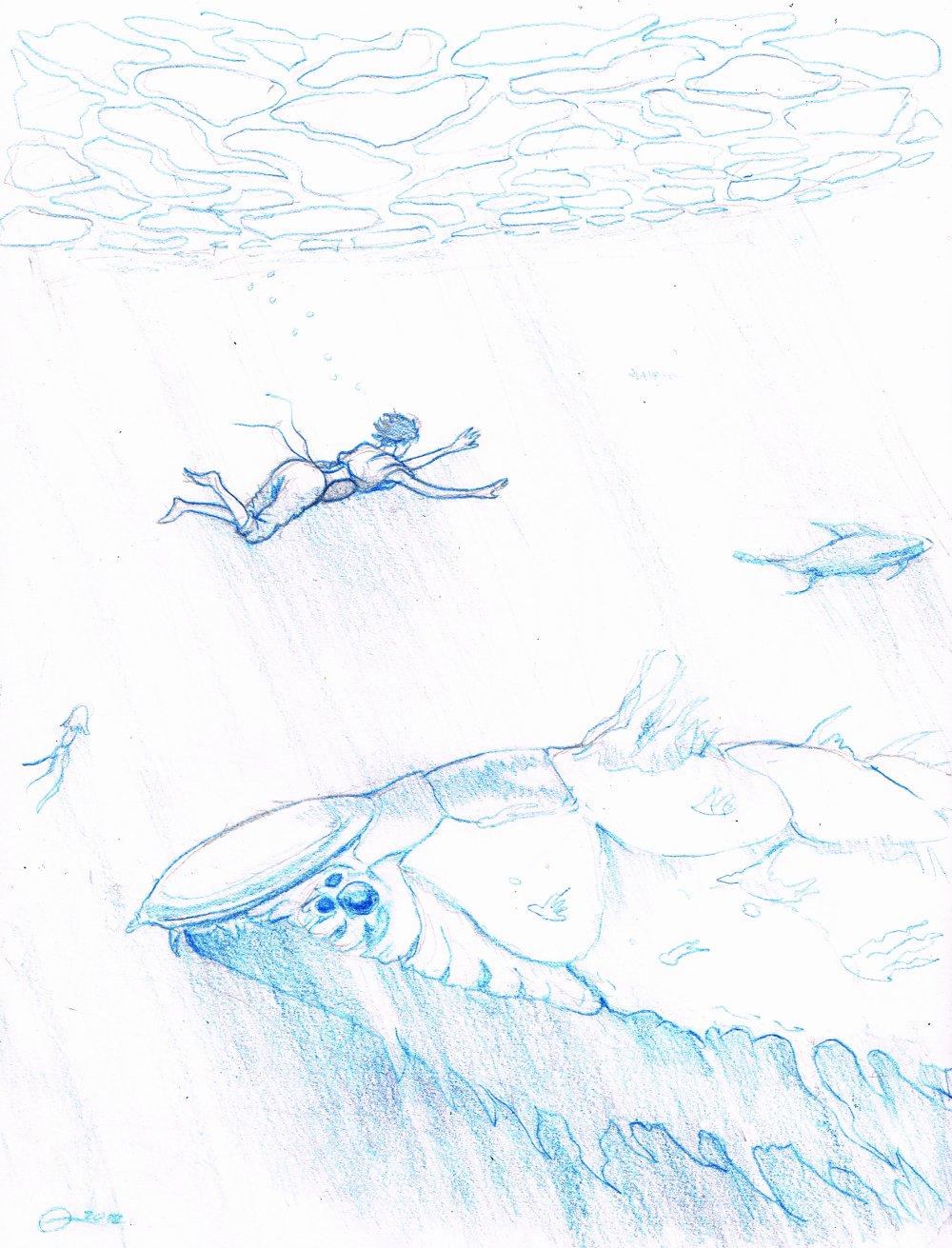 Drawing a ponderous aquatic creature was a challenge. The oriented light rays help giving the image its depth and placing the volumes.